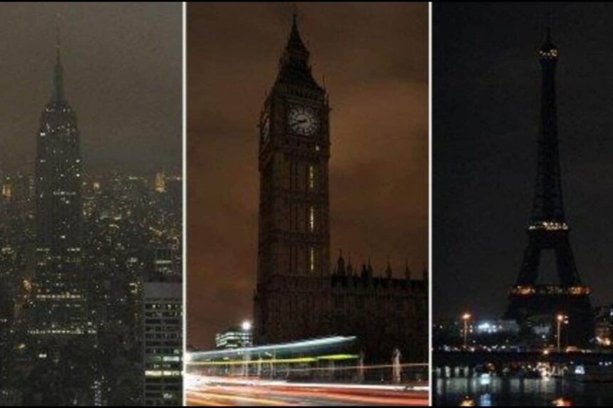 உலகம் முழுக்க இருளில் மூழ்கிய வானலாவிய கட்டடங்கள்… இதுதான் காரணம்!