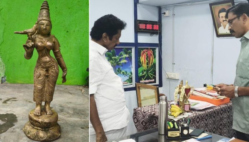 தொடர்ந்து தொழிலாளர்கள் குழியை பறித்து, அந்தச் சிலையை எடுத்தபோது, ஐம்பொன்னாலான சுமார் ஓர் அடி உயரமுள்ள தோளில் கிளி அமர்ந்து இருக்கும் நிலையில், 6 கிலோ எடையிலான மீனாட்சியம்மன் சிலை எனத் தெரியவந்தது. இது குறித்து சரண்யா உடனடியாக வருவாய் துறையினருக்கு தகவல் அளித்தார்.
