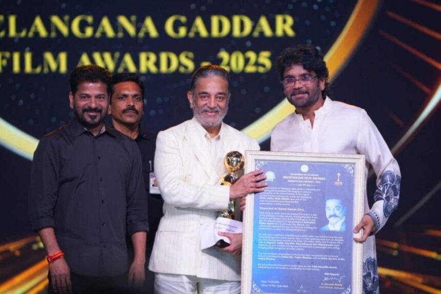 நடிகர் கமல்ஹாசனுக்கு தெலங்கானா அரசின் ‘பைடி ஜெய்ராஜ்’ விருது வழங்கப்பட்டது. ஹைதராபாத்தில் நடந்த விழாவில் முதல்வர் அனுமுலா ரேவந்த் ரெட்டி விருது வழங்கினார்.