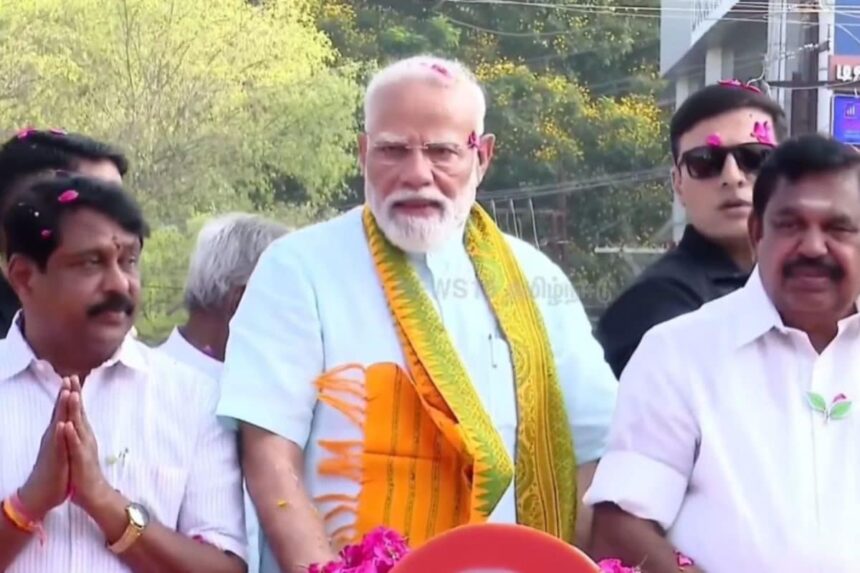 நாகர்கோவிலில் பிரதமர் நரேந்திர மோடி ரோடு ஷோ நடத்தினார், அதிமுக எடப்பாடி பழனிசாமி பாஜக நயினார் நாகேந்திரன் அண்ணாமலை உள்ளிட்டோர் பங்கேற்றனர்