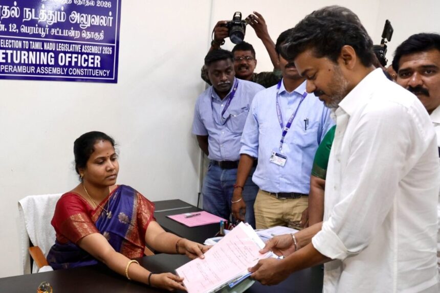தெவெக தலைவர் விஜய் பெரம்பூரில் வேட்புமனு தாக்கல், அசையும் சொத்து 404.58 கோடி, அசையா சொத்து 11.51 கோடி, 5 கார்கள், கடன் இல்லை, மனைவி சங்கீதாவுக்கு 391 சவரன் நகை